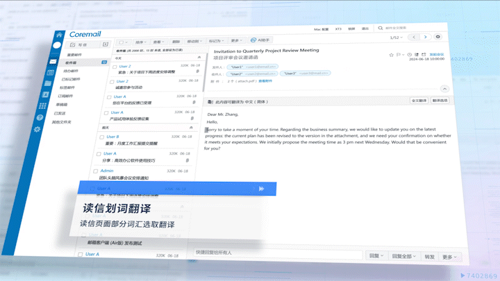 擔(dān)心語言關(guān)成為工作阻礙?Coremail郵箱支持多語言翻譯,一鍵即可實(shí)現(xiàn)全文對(duì)照翻譯,幫助用戶快速攻克語言關(guān),助力跨語言高效溝通。