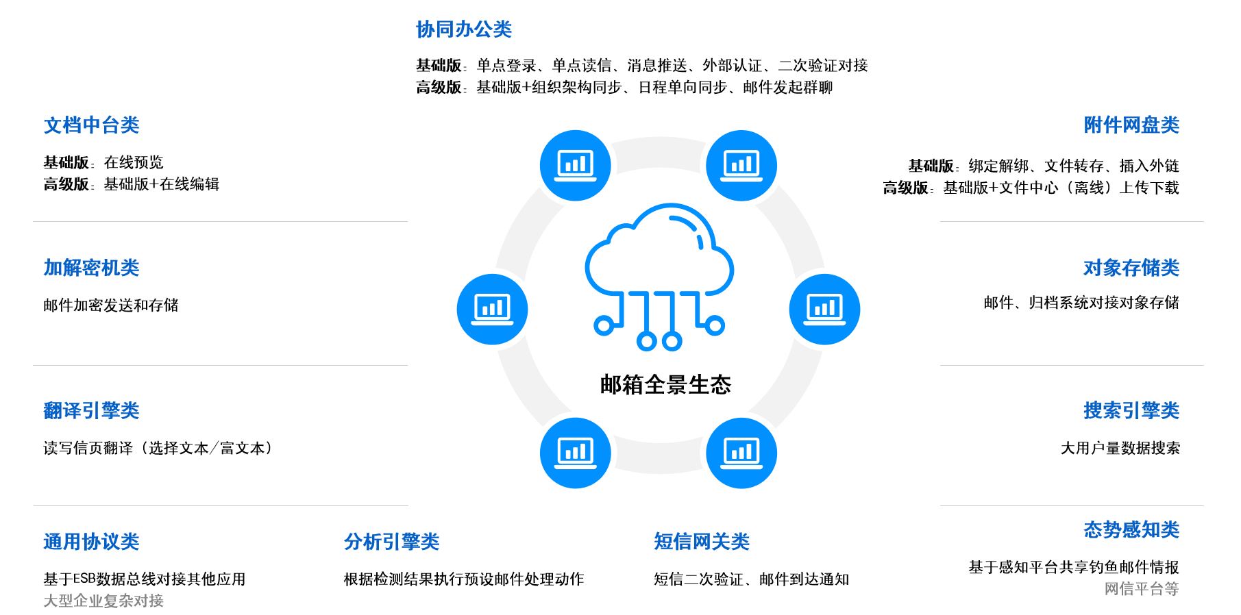 Coremail CKIT采用標(biāo)準(zhǔn)化協(xié)議和接口,支持對接企微、釘釘、飛書、藍凌、竹云、致遠、金蝶云等OA平臺深度集成對接。在實踐中,部分客戶通過ESB總線集成,Coremail CKIT可充當(dāng)連接 ESB 和郵件系統(tǒng)的橋梁。在作為接口調(diào)用方時,CKIT 通過 ESB 實現(xiàn)了多類關(guān)鍵外部能力的無縫集成,如短信網(wǎng)關(guān)、統(tǒng)一認證系統(tǒng)、單點登錄體系等。同時,CKIT 也通過 ESB 以接口提供方身份,對外提供標(biāo)準(zhǔn)化服務(wù)能力。嚴格遵循 ESB 接口規(guī)范,封裝并發(fā)布郵件發(fā)送服務(wù),使得其他業(yè)務(wù)系統(tǒng)可通過企業(yè)總線高效、可靠地調(diào)用郵件功能,實現(xiàn)通知、告警等業(yè)務(wù)的自動化流轉(zhuǎn)。
