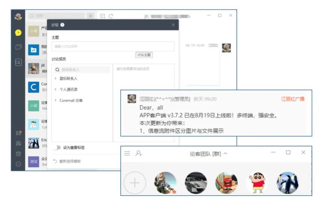 根據(jù)不同需求和不同對象,選擇多樣的會話場景。支持建立私聊、討論、廣播、群,匹配不同的交流模式。