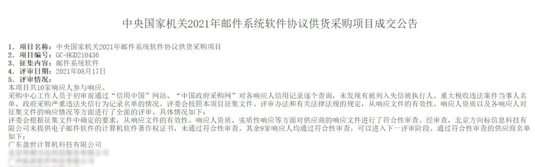 近日,《中央國家機(jī)關(guān)2021年郵件系統(tǒng)軟件協(xié)議供貨采購項目成交公告》發(fā)布,Coremail郵件系統(tǒng)成功中標(biāo),再次入選!