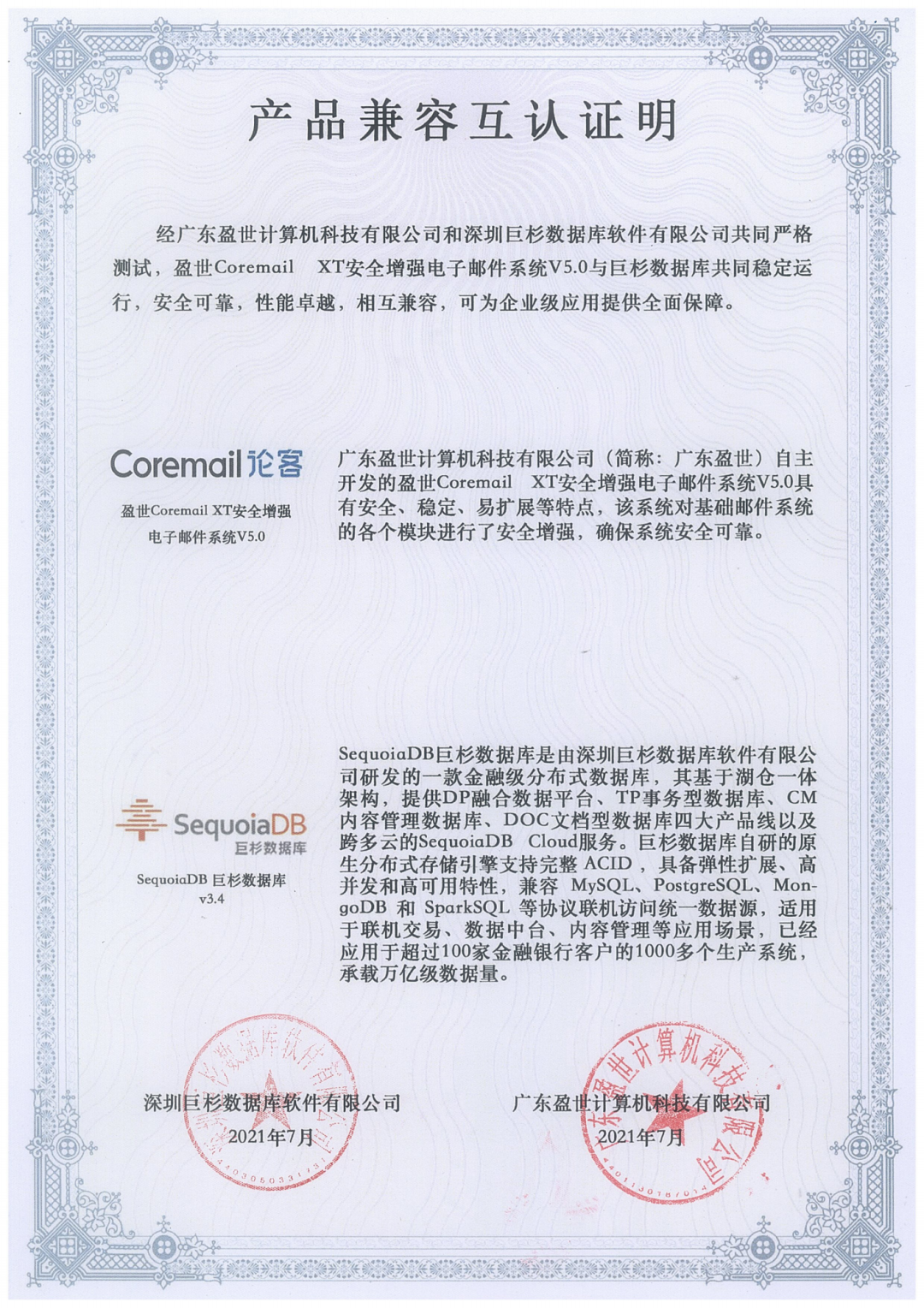 因此,為了保障企業(yè)海量數(shù)據(jù)信息安全,提升企業(yè)信息安全水平。近期,Coremail旗下產(chǎn)品盈世Coremail XT 安全增強(qiáng)電子郵件系統(tǒng)、論客Coremail XT 安全增強(qiáng)電子郵件系統(tǒng)等與SequoiaDB巨杉數(shù)據(jù)庫(kù)順利完成產(chǎn)品兼容適配,經(jīng)過(guò)雙方共同嚴(yán)格測(cè)試,結(jié)果表明:產(chǎn)品能夠穩(wěn)定兼容,共同運(yùn)行,性能良好,可以為企業(yè)級(jí)客戶提供安全穩(wěn)定可靠保障。