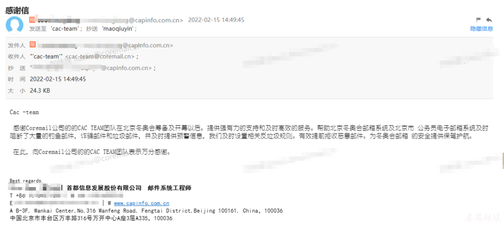 賽場(chǎng)上,冬奧健兒們奮力拼搏,為世界人民奏響了“一起向未來”的時(shí)代強(qiáng)音;賽場(chǎng)下,廣東盈世技術(shù)團(tuán)隊(duì)7x24小時(shí)值守,日夜關(guān)注郵件威脅態(tài)勢(shì),堅(jiān)守北京冬奧郵箱信息安全防線。冬奧會(huì)期間,Coremail CAC郵件安全中心為冬奧會(huì)郵箱有效識(shí)別和處置釣魚郵件1160封,垃圾郵件3927封,有效防范了各類郵件攻擊。郵件系統(tǒng)各項(xiàng)安全防護(hù)機(jī)制運(yùn)行良好,未發(fā)生郵箱賬號(hào)被盜等安全事件。