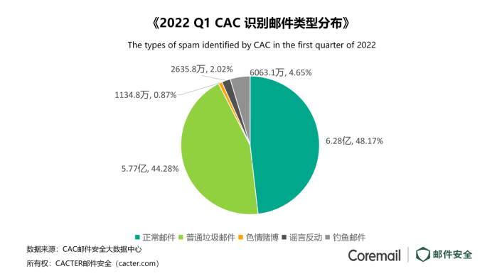 僅就正常郵件而言,統(tǒng)計(jì)顯示,全國企業(yè)郵箱用戶在2022第一季度年共收發(fā)正常郵件僅占6億2785萬,占比48.17%。普通垃圾郵件占比44.82%,嚴(yán)重影響郵件交流。