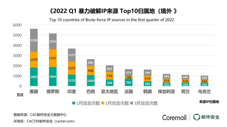 根據(jù)CAC郵件安全大數(shù)據(jù)中心監(jiān)測,2022年Q1季度,境外暴力破解IP主要來源于美國,俄羅斯以及印度。