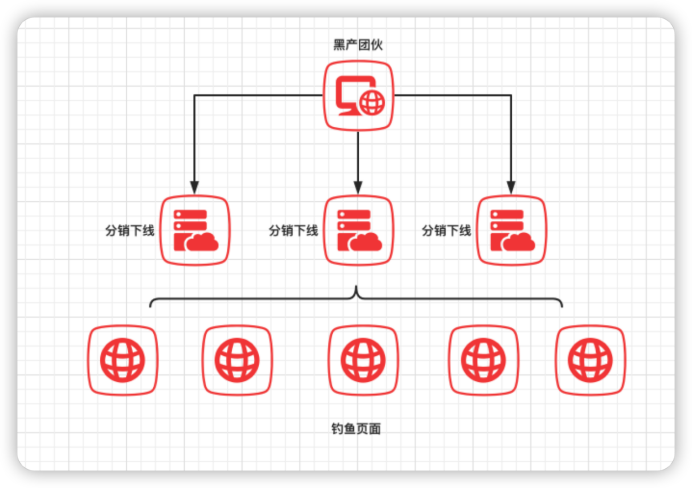 通過對黑產(chǎn)業(yè)務(wù)的摸排,還原出黑產(chǎn)團(tuán)隊(duì)的組織架構(gòu)。由主團(tuán)伙負(fù)責(zé)開發(fā)和維護(hù)建站模版,使用寶塔統(tǒng)一部署。在找到分銷的下線之后,為下線部署一個(gè)管理后臺(tái),然后將一個(gè)隨機(jī)生成的域名綁定到釣魚服務(wù)器上。