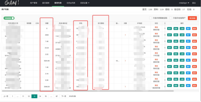 用戶功能處顯示所有受害者的姓名、銀行卡號(hào)、身份證號(hào)、手機(jī)號(hào)、支付密碼、IP地址\地區(qū)、在線狀態(tài)、使用設(shè)備、操作記錄和添加時(shí)間等信息。