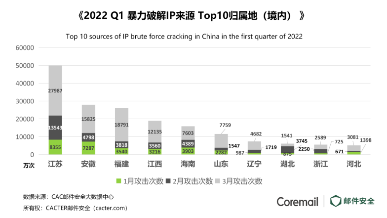 IP來自國內(nèi)的暴力破解次數(shù)持續(xù)上漲,3月環(huán)比增幅高達(dá)157%,3月主要集中地區(qū)是江蘇,安徽,福建和江西。