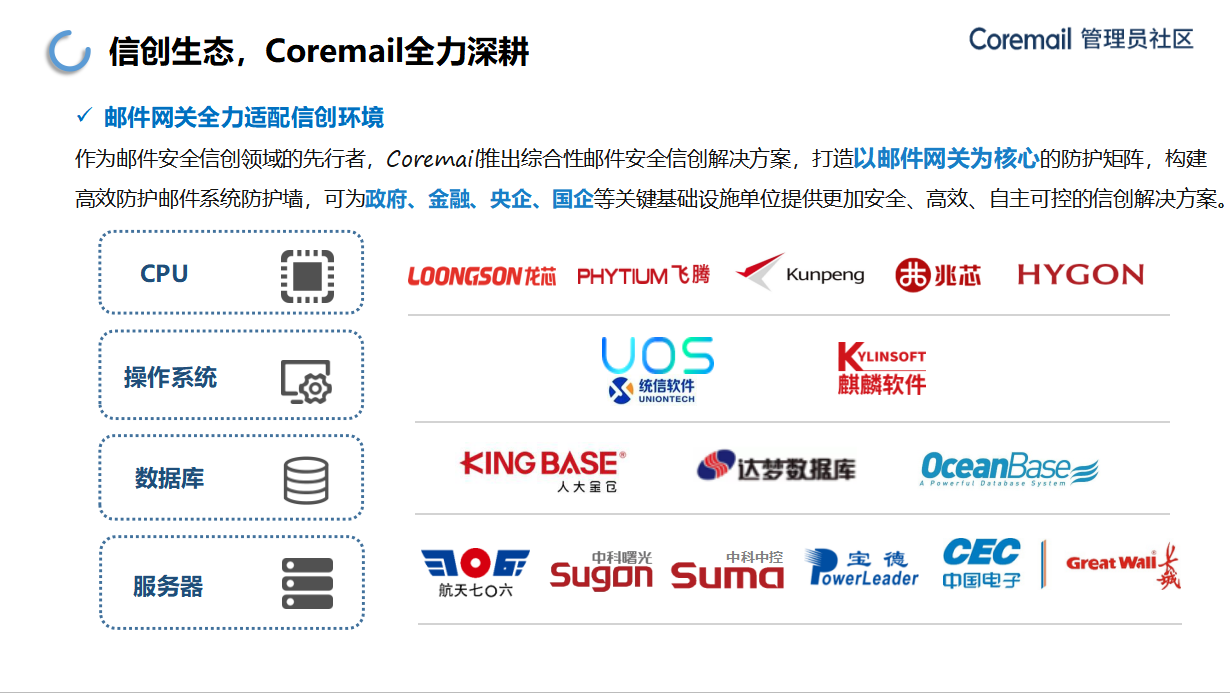 基于國(guó)產(chǎn)化CPU底座,CACTER郵件安全網(wǎng)關(guān)能夠兼容主流的國(guó)產(chǎn)操作系統(tǒng)、數(shù)據(jù)庫(kù)等信創(chuàng)生態(tài)的軟硬件產(chǎn)品,并可結(jié)合金融行業(yè)在郵件安全應(yīng)用場(chǎng)景,防護(hù)方案,賦能教育、金融、政府、IT互聯(lián)網(wǎng)、央企國(guó)企及大型民營(yíng)企業(yè)等。