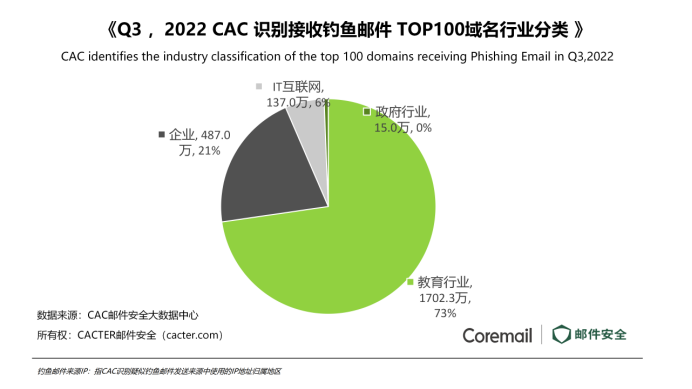對(duì)比“Q2 CAC 識(shí)別釣魚郵件數(shù)量”,Q3釣魚郵件攀升至5849.2萬,環(huán)比上升 48.12%,同比上升10.78%。