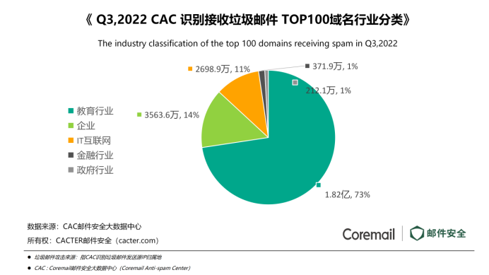 據(jù)分析,Q3 TOP 100 域名中,無論是接收釣魚郵件數(shù)量、接收垃圾郵件數(shù)量、被暴力破解攻擊次數(shù),均為教育行業(yè)遭受的威脅最大。