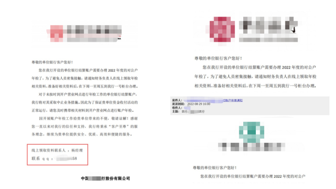 Coremail中心Q3監(jiān)測到一種新型的BEC詐騙郵件正在泛濫,詐騙團(tuán)伙冒充國家各大銀行,以企業(yè)銀行賬戶年審為由,要求企業(yè)、財(cái)務(wù)和出納人員加QQ獲取年審材料。