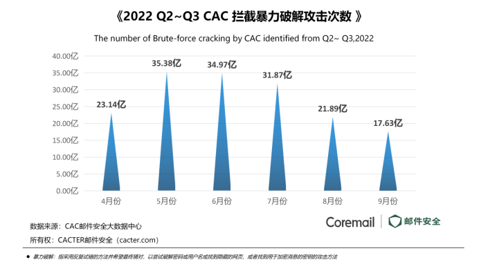 根據(jù)CAC郵件安全大數(shù)據(jù)中心監(jiān)測,對(duì)比Q2Coremail攔截93億4885萬次暴力破解攻擊,Coremail Q3共攔截了71億3924萬暴力破解攻擊,降幅達(dá)到23.6%。