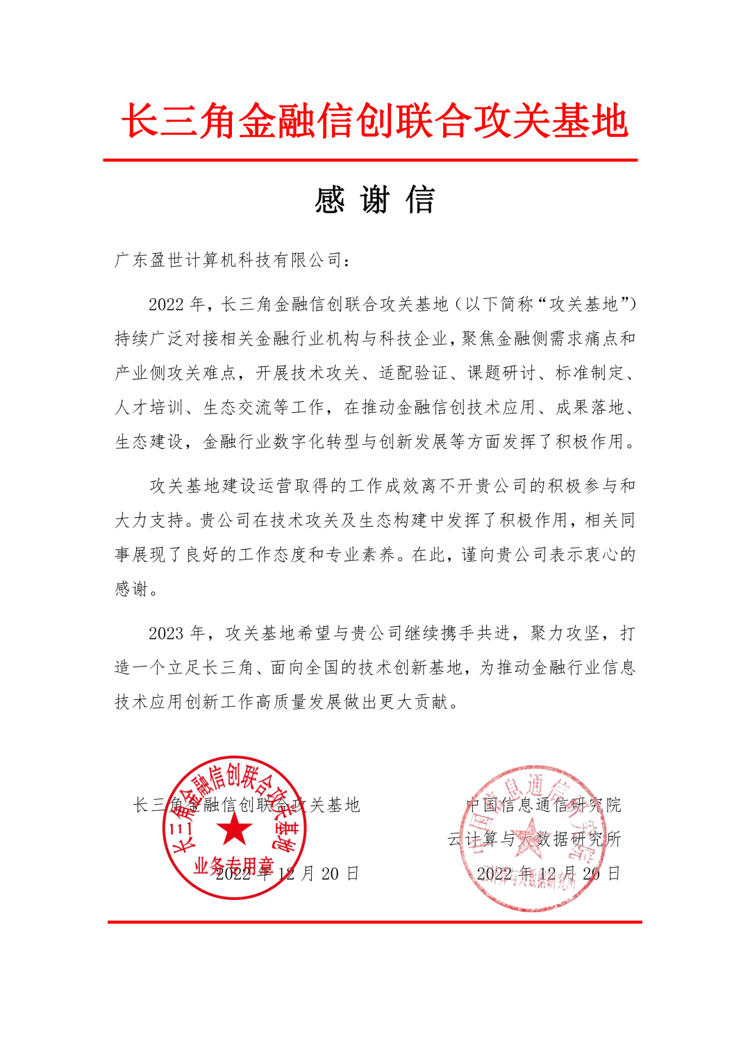 長三角金融信創(chuàng)聯(lián)合攻關(guān)基地《感謝信》