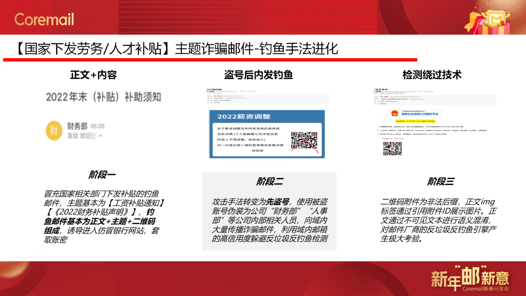 2021年CAC識(shí)別釣魚郵件1.81億,2022年上升至2.25億,增幅高達(dá)24.1%,企業(yè)用戶面臨潛在經(jīng)濟(jì)損失不可估量。同時(shí),2022年盜號(hào)問題依然猖獗,盜號(hào)黑產(chǎn)逐漸呈現(xiàn)規(guī)?;厔荩髽I(yè)、政府云郵箱成為黑產(chǎn)盜號(hào)重災(zāi)區(qū)。朱老師分析了釣魚郵件、賬號(hào)盜取、BEC詐騙、病毒郵件4種惡意郵件流行戰(zhàn)術(shù),針對(duì)去年典型的詐騙郵件主題全面復(fù)盤,解析詐騙分子的釣魚手法。