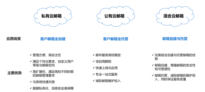 Coremail擁有豐富的企業(yè)郵箱搭建經(jīng)驗,支持選擇私有云、公有云、混合云搭建,可滿足用戶按需開通的運營要求,為企業(yè)上云提供便利。