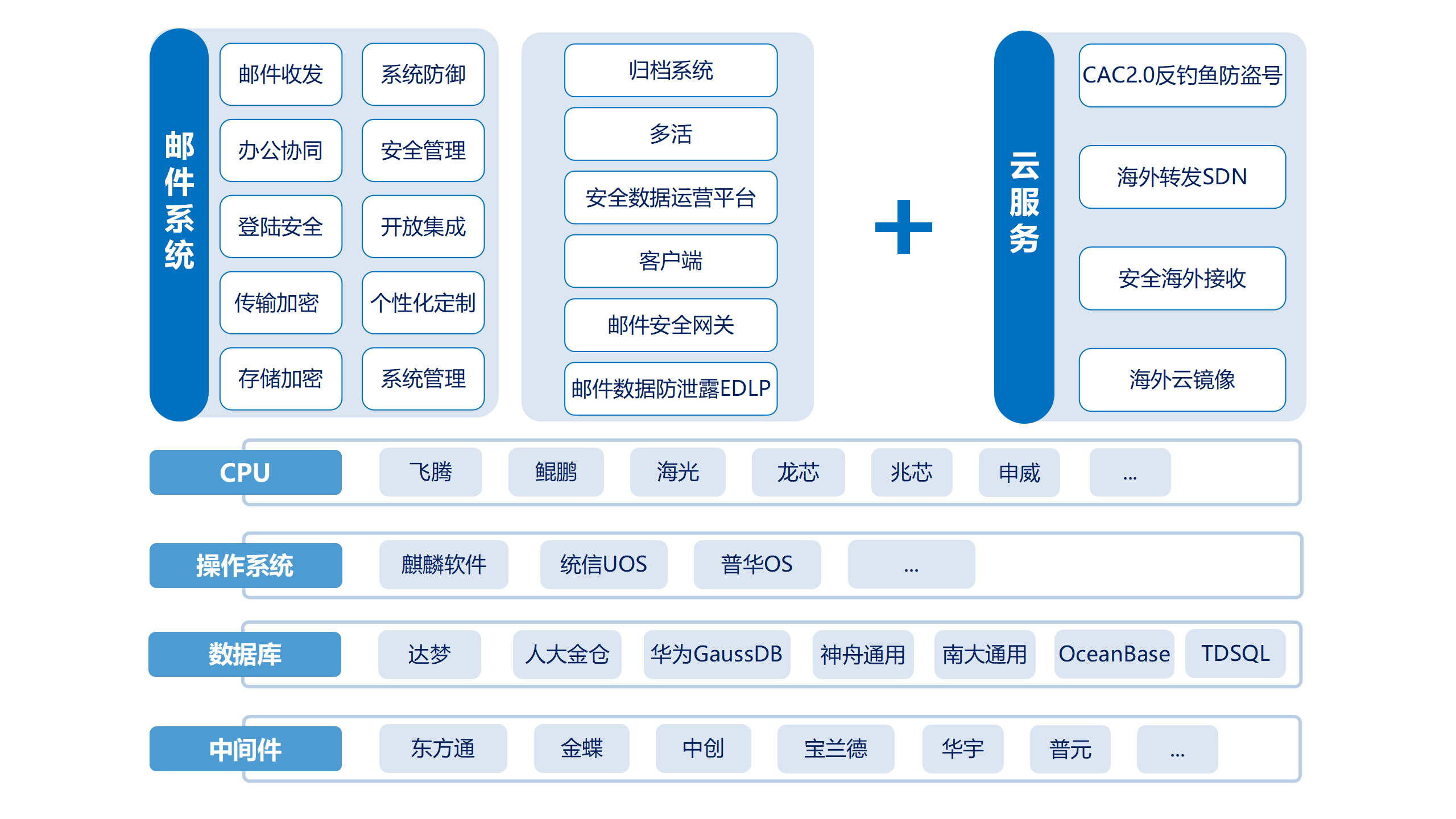 基于Coremail 在郵件行業(yè)深耕24年的技術(shù)積累和研發(fā)經(jīng)驗(yàn),Coremail云郵箱緊密貼合各行業(yè)客戶(hù)辦公場(chǎng)景,全面適配國(guó)產(chǎn)主流軟硬件產(chǎn)品,適應(yīng)各行業(yè)的數(shù)據(jù)安全要求,全面滿(mǎn)足客戶(hù)的國(guó)產(chǎn)化、高效管理、安全防護(hù)、協(xié)同辦公、業(yè)務(wù)系統(tǒng)集成等核心需求。