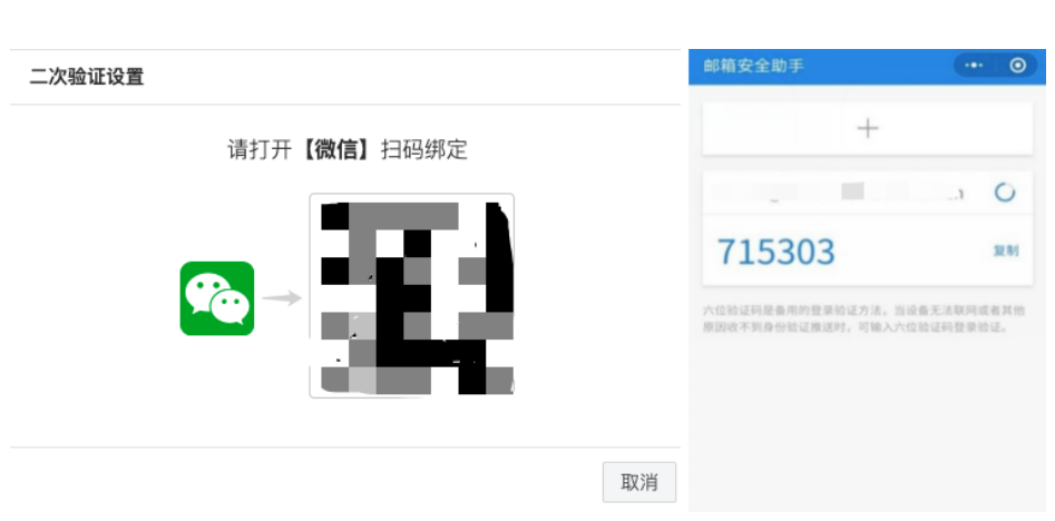 2)在webmail或Coremail 郵箱客戶端軟件 V4.0及以上版本的二次驗證綁定頁,用微信掃碼完成綁定。