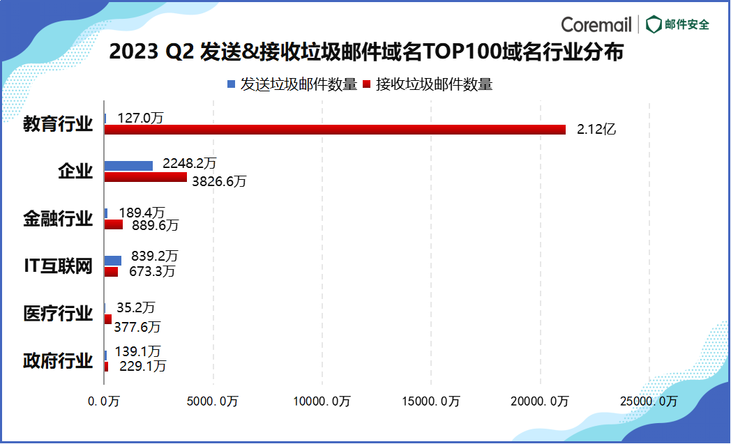 (2) 高校師生的郵箱是攻擊者竊取的重點(diǎn)目標(biāo)。根據(jù)Coremail郵件安全人工智能實(shí)驗(yàn)室(以下簡(jiǎn)稱(chēng)AI實(shí)驗(yàn)室)監(jiān)測(cè),2023年Q2季度,在TOP100域名接收垃圾郵件源中,教育行業(yè)接收量達(dá)到2.12億封,環(huán)比增長(zhǎng)33.18%,位居高位,仍是垃圾郵件的重災(zāi)區(qū)。