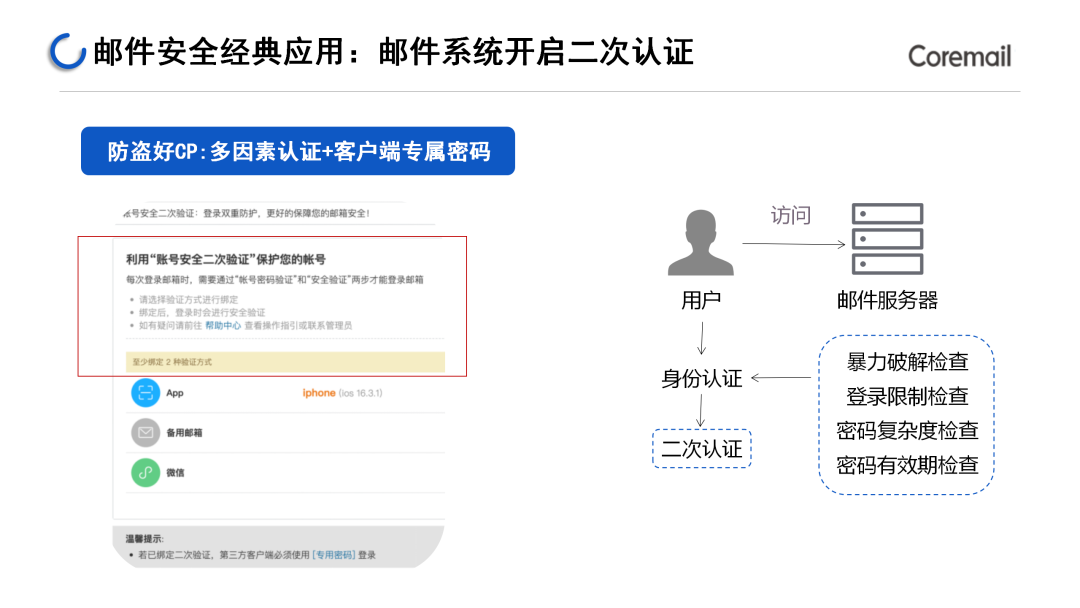 吳總提出,筑牢校園信息安全防線,不僅需要釣魚演練提升師生安全意識,守護好賬號安全也是很有必要的,Coremail郵件解決方案配備二次驗證和客戶端專用密碼,能有效應對暴力破解等惡意攻擊。