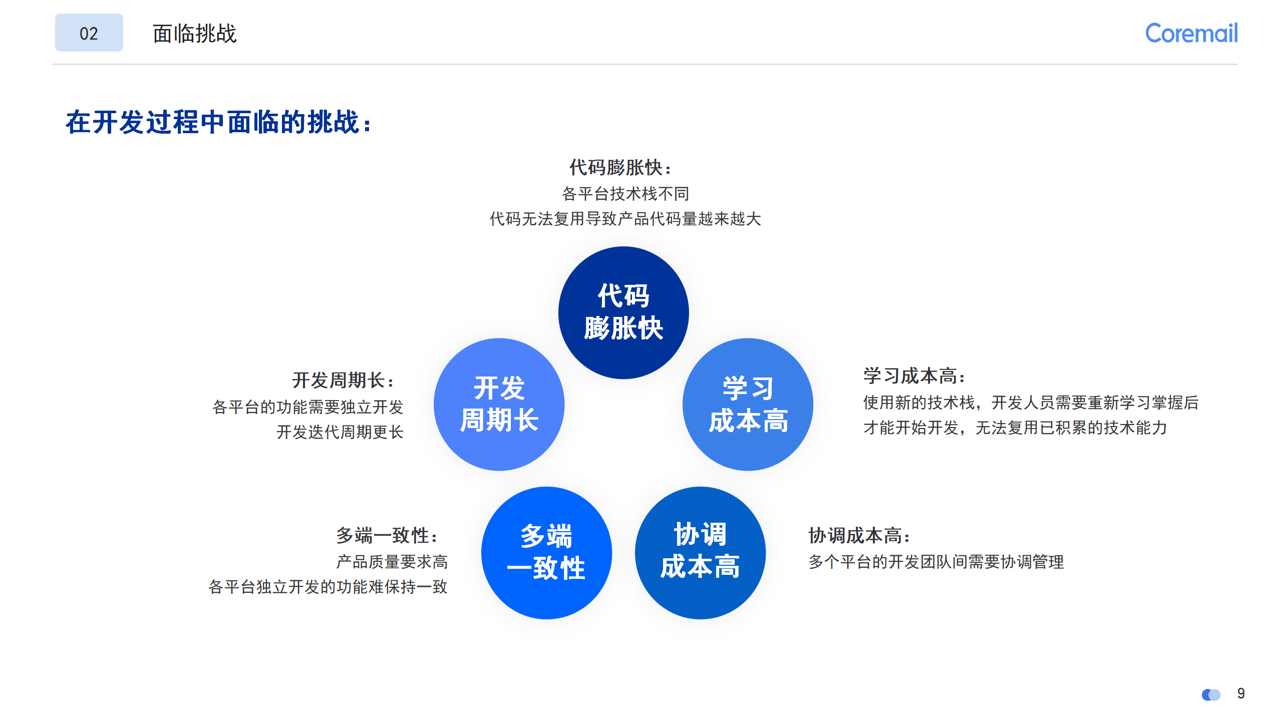 圍繞研發(fā)過(guò)程中面臨的等多項(xiàng)難題,郝總進(jìn)行了深入淺出的講解和經(jīng)驗(yàn)分享。在開(kāi)發(fā)過(guò)程中,面對(duì)代碼膨脹快、開(kāi)發(fā)周期長(zhǎng)、學(xué)習(xí)成本高、多端一致性、協(xié)調(diào)成本高等難題,針對(duì)性提出解決思路及應(yīng)對(duì)經(jīng)驗(yàn)。