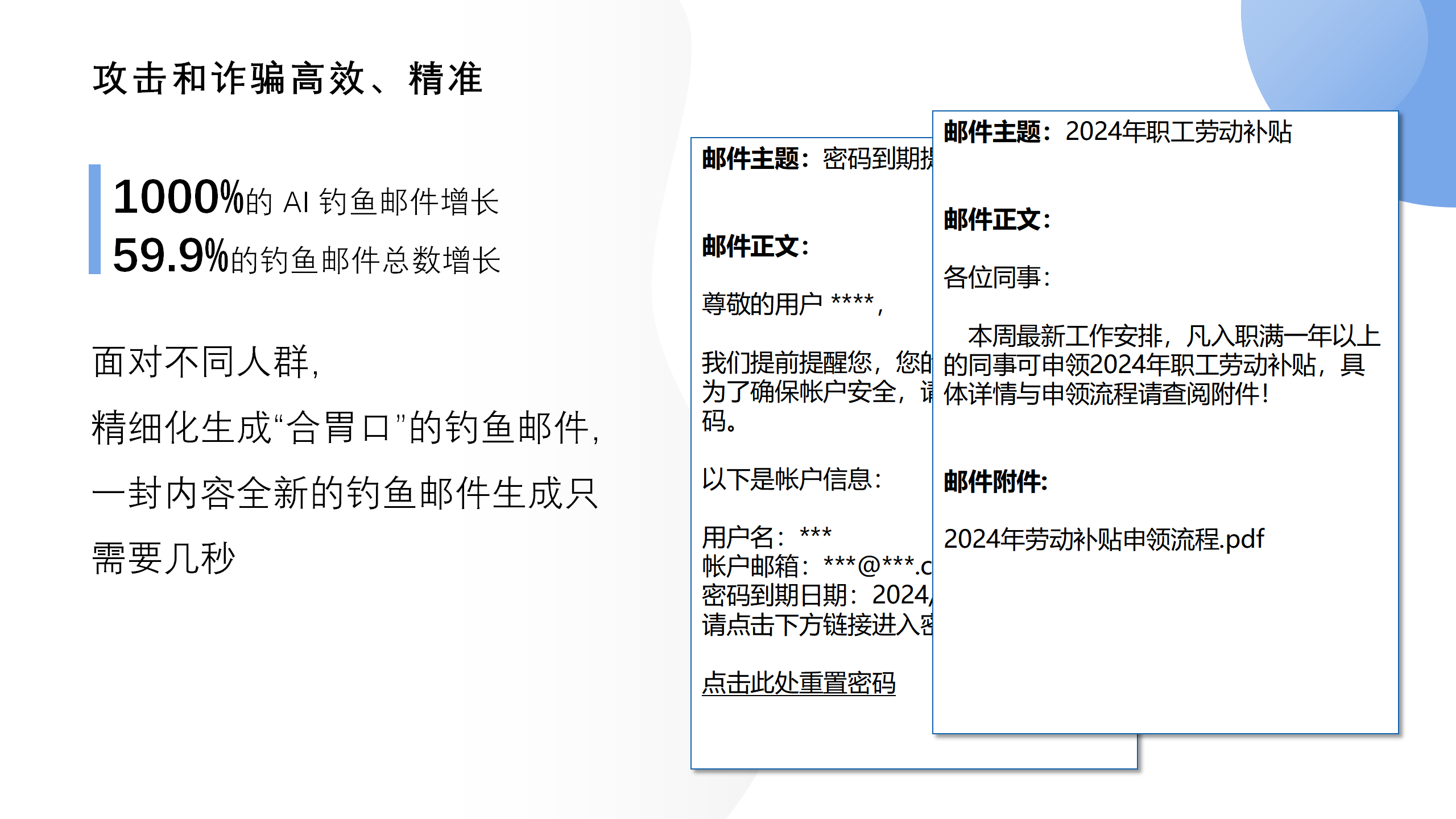 吳總提到,當今數(shù)字化的時代,AI 技術(shù)正以前所未有的速度改變著我們的工作和生活方式。在郵件領(lǐng)域,AI的應用讓郵件辦公更智能、更高效。但同時,黑產(chǎn)也在利用AI使釣魚郵件變得更加豐富和逼真,嚴重威脅數(shù)據(jù)安全。