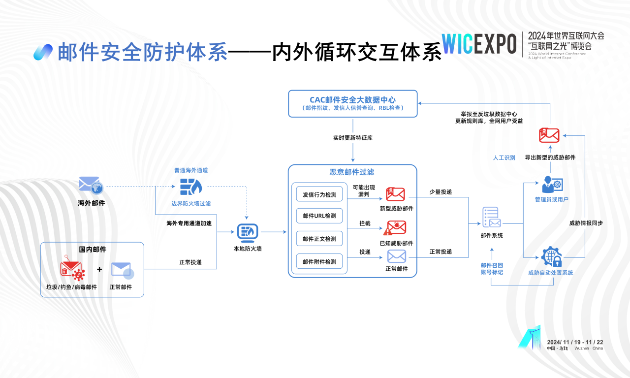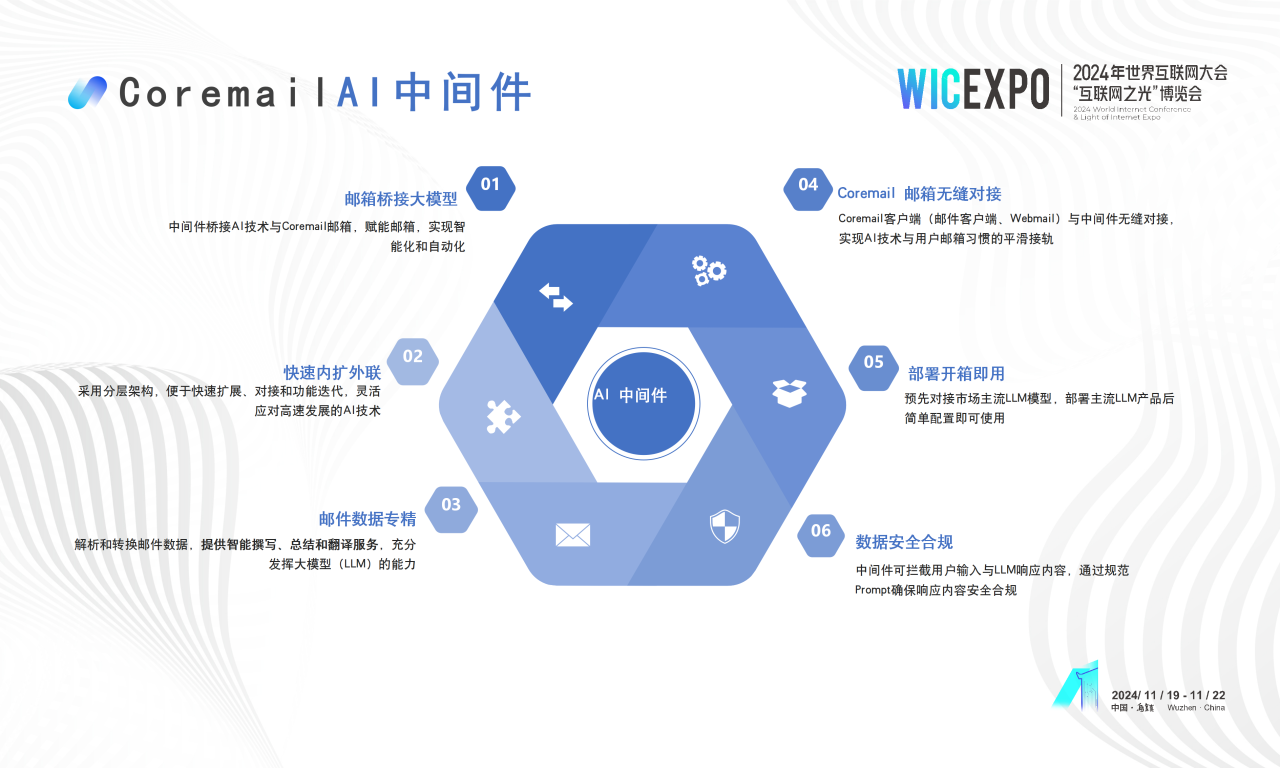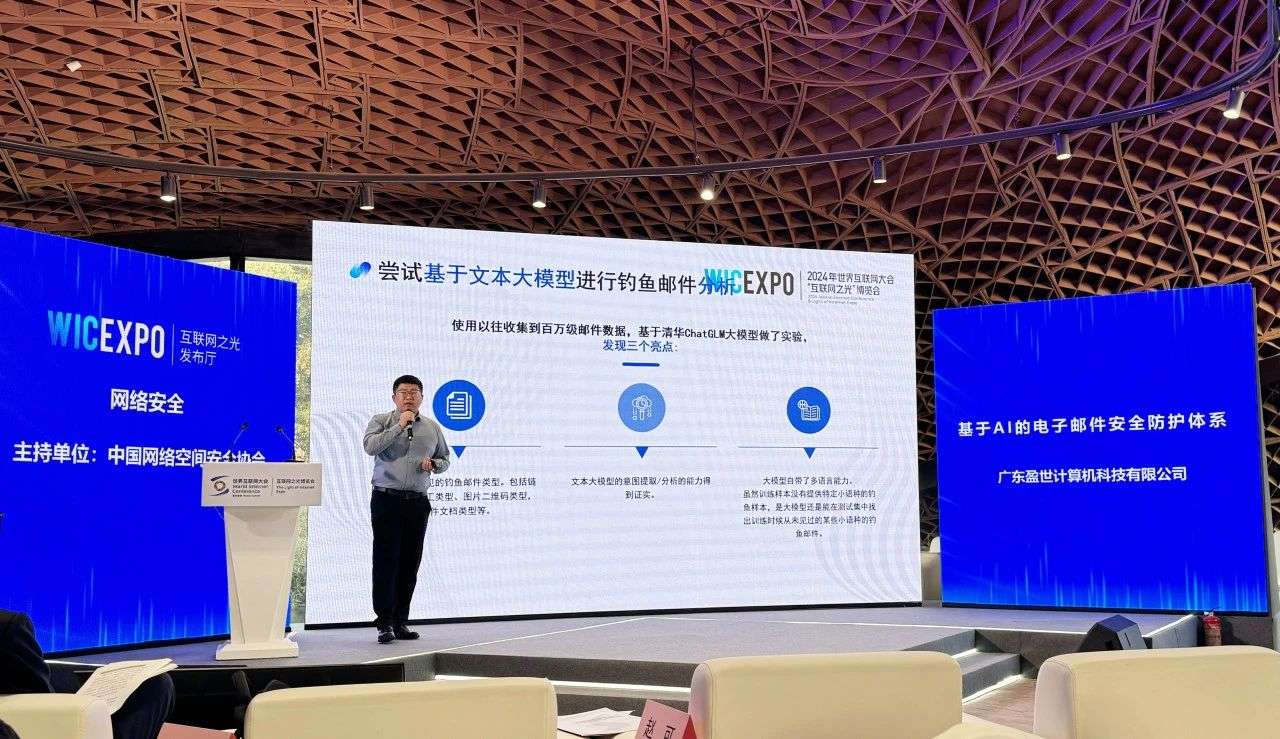 11月19-22日,2024年世界互聯(lián)網(wǎng)大會(huì)烏鎮(zhèn)峰會(huì)盛大舉辦,期間,“互聯(lián)網(wǎng)之光”博覽會(huì)“網(wǎng)絡(luò)安全”新產(chǎn)品新技術(shù)發(fā)布活動(dòng)在烏鎮(zhèn)互聯(lián)網(wǎng)國(guó)際會(huì)展中心紅亭發(fā)布區(qū)舉行,Coremail亮相發(fā)布現(xiàn)場(chǎng),展示郵箱與AI的探索實(shí)踐成果。