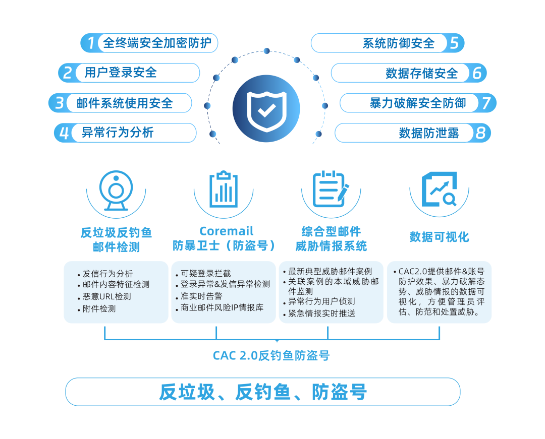 Coremail提供全面、多機制的保護策略,打造郵件安全生態(tài)體系,全方位保護郵件系統(tǒng)數(shù)據(jù)安全。在數(shù)據(jù)傳輸方面,采用安全算法的SSL、TSL協(xié)議,確保郵件傳輸安全。在數(shù)據(jù)存儲方面,使用的是自主研發(fā)的加密算法,同時采用多重手段構(gòu)建系統(tǒng)防御安全,對郵件系統(tǒng)實行全面監(jiān)控、審計與管理。同時,客戶可選擇配備組織級或系統(tǒng)級的雙因子驗證,在輸入密碼后,用戶仍需要進行第二層認證才可登錄,極大地保護了郵箱數(shù)據(jù)安全。
