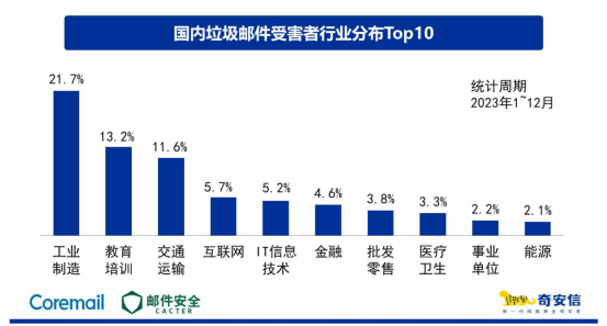 郵件安全向來是教育行業(yè)的一大痛點,由于教育行業(yè)的特殊性和重要性,國外勢力、黑產(chǎn)鏈條虎視眈眈,根據(jù)Coremail AI實驗室監(jiān)測分析,2023年度不論是收到的釣魚郵件數(shù)、垃圾郵件量,還是遭受到暴力破解攻擊的次數(shù),教育行業(yè)都居高不下。
